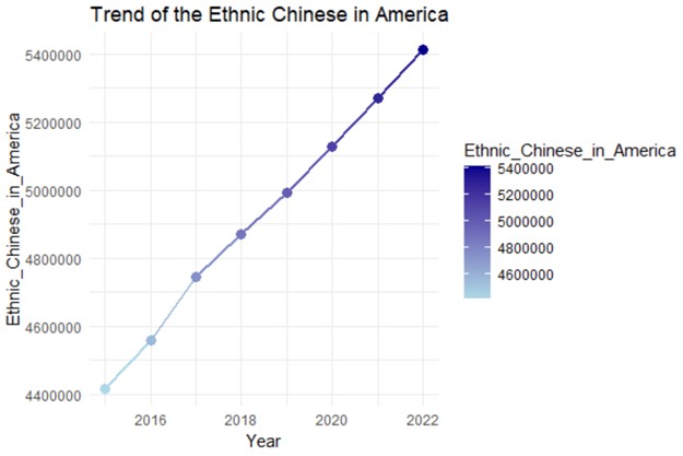 從2015年到2022年,在美國的華裔人口數量一直呈穩步上升趨勢,從2015年的4,416,876人,增長至2022年的5,326,595人,短短七年裡面就增長了將近一百萬人。該趨勢即使在疫情大爆發期間也未改變。