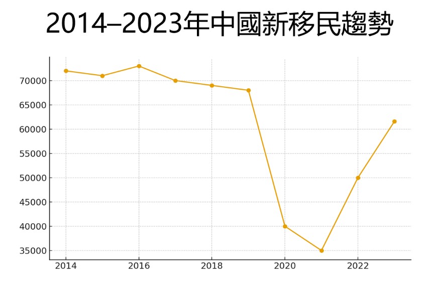 2015–2019年,每年新獲綠卡的中國移民人數穩定在七萬左右。然而,2020–2021年因新冠疫情、旅行限制與中美關係緊張,數字明顯下滑。直到2022–2023年,才逐漸恢復。