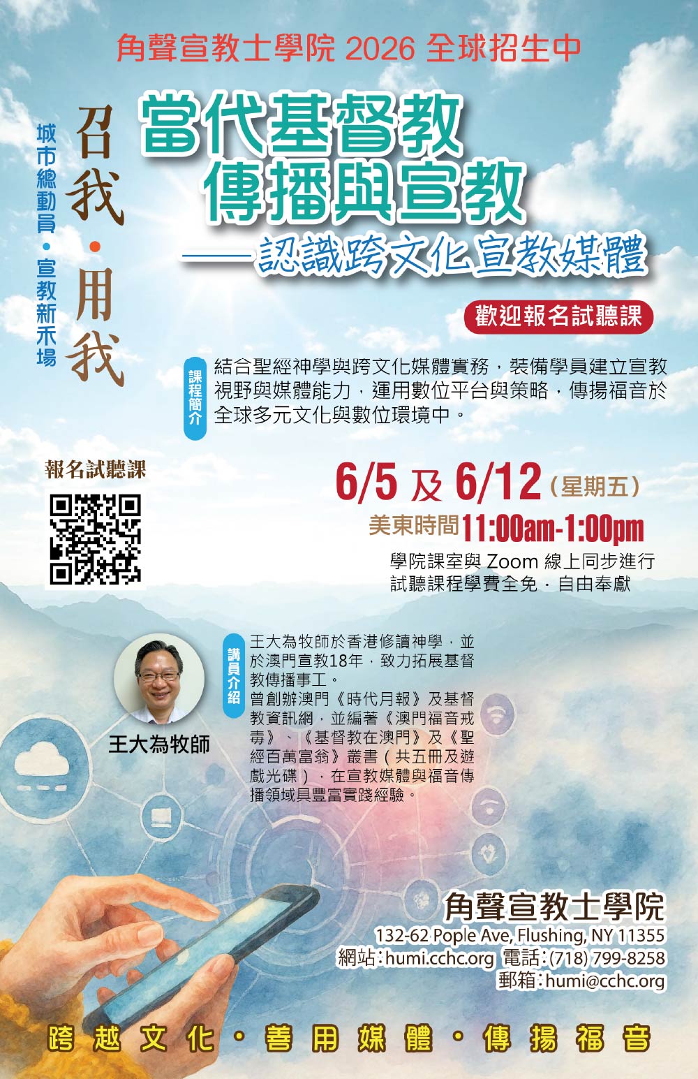 課程簡介:結合聖經神學與跨文化媒體實務,裝備學員建立宣教視野與媒體能力,運用數位平台與策略,傳揚福音於全球多元文化與數位環境中。